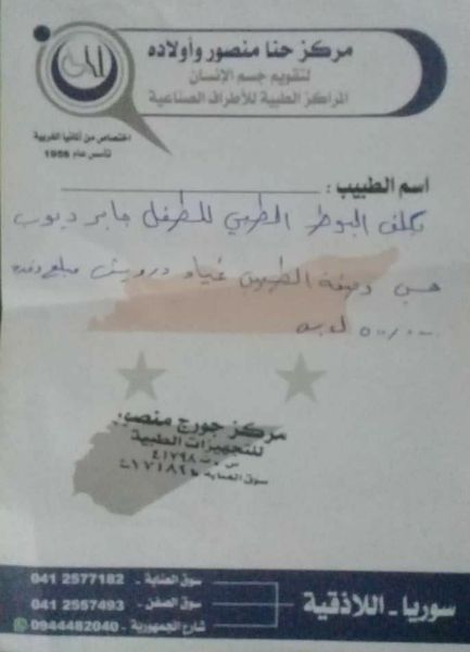 و طلبت آلة لقص الحديد ليستطيع زوجها العمل عليها من البيت ليؤمن احتياجاتهم و فعلاً اشترت الآلة مع معداتها وارسلت لنا ايصالاً بقيمة 3250000 ثم ارسلنا لها 550000 لتشتري مستلزمات غذائية تكفي عائلتها لعدة أشهر و لتكمل جلسات علاج آرام .